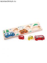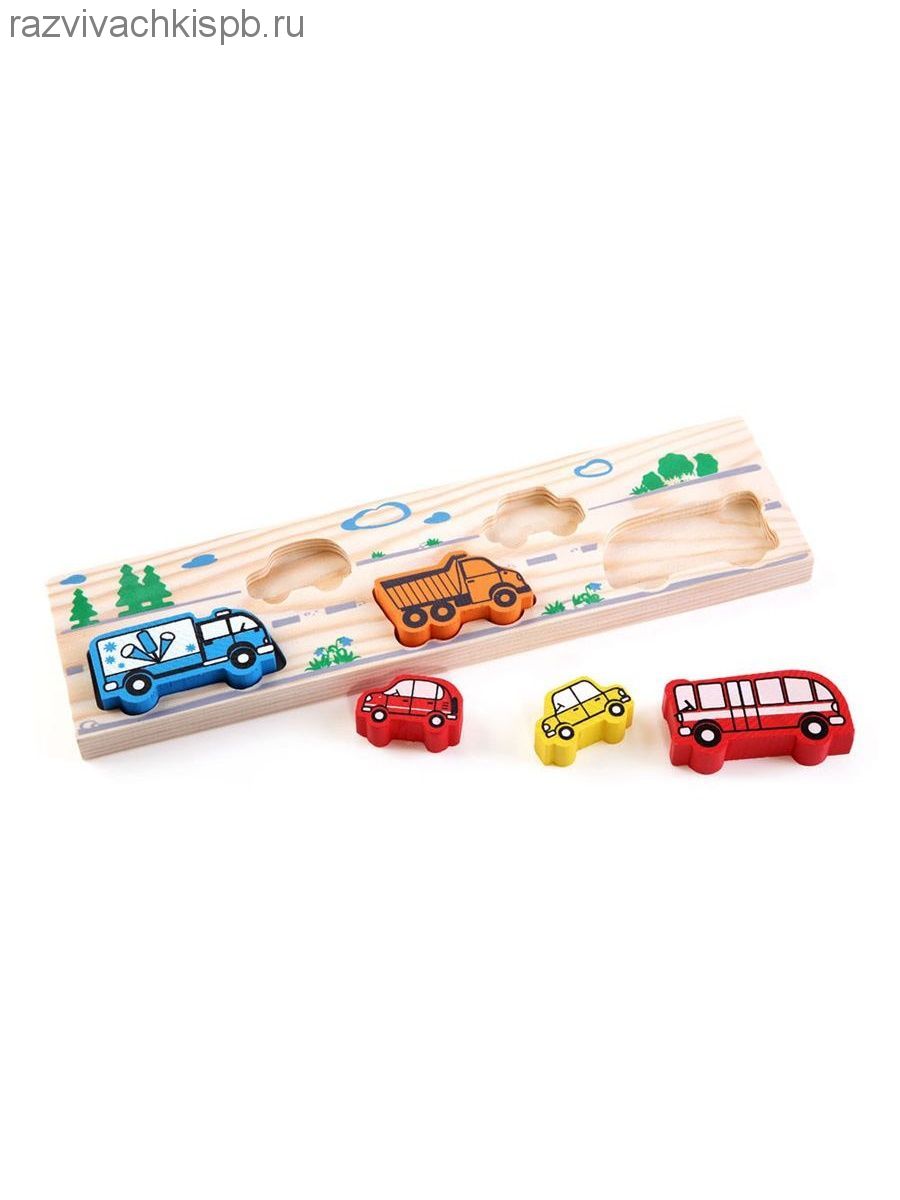 Деревянная Доска-вкладыш "Транспорт" состоит из 5 фигурок легковых и грузовых автомобилей, которые нужно установить в подходящие по форме отверстия.