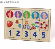 Игра поможет выработать у малыша ассоциативный ряд между визуальным образом и цифрой. На 15 элементах пазла размерами 50х45 мм нанесены цифры от одного до пяти, а так же сопоставимое им количество пальчиков, животных и предметов.