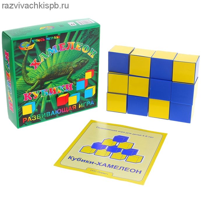 Хамелеон» - увлекательная развивающая игра для деток от 4-х лет, которая состоит из 12-ти одинаковых по размеру и цветовой гамме кубиков. Три грани одной вершины синие, а другие три стороны желтые, для лучшего образного восприятия строящихся фигур. Это именно та игра, с которой начинается освоение азов черчения. К набору прилагается брошюра со схемами, по которым юный творец будет возводить свои строительные объекты. «Хамелеон» способствует развитию у деток воображения, образного и пространственного мышления, умения логически комбинировать фигуры. Кубики «Хамелеон» от фирмы «Корвет» незаменимы для формирования у ребёнка пространственных представлений. С их помощью можно создавать сооружения и постройки: башенки, диваны, самолёты, лесенки, домики и т.д. Игра необходима всем детям дошкольного и младшего школьного возраста, особенно тем, у кого недостаточно развито образное мышление и умение осуществлять комбинаторные действия.