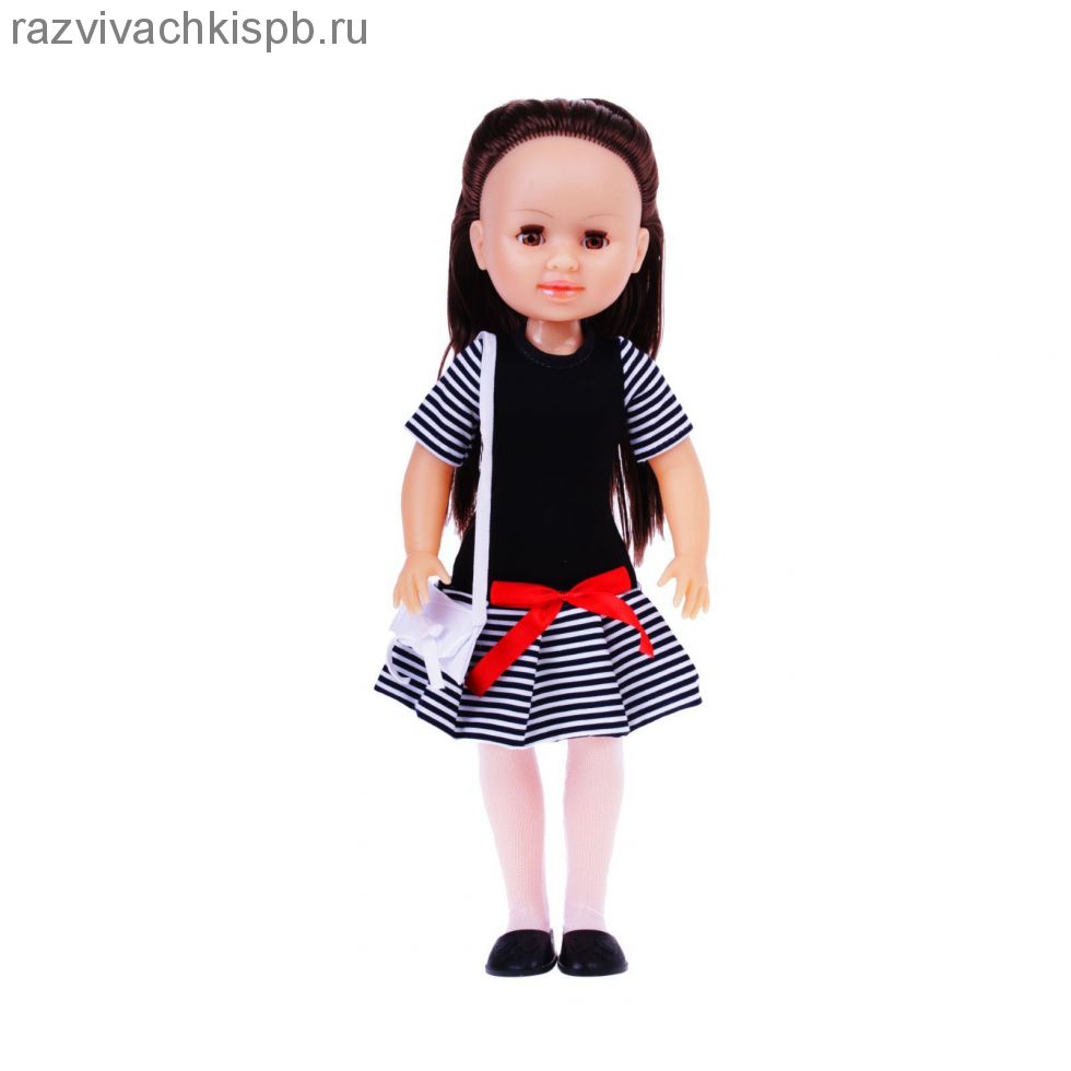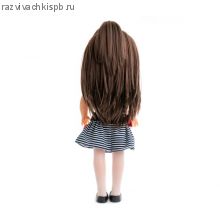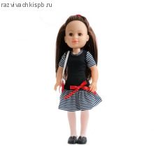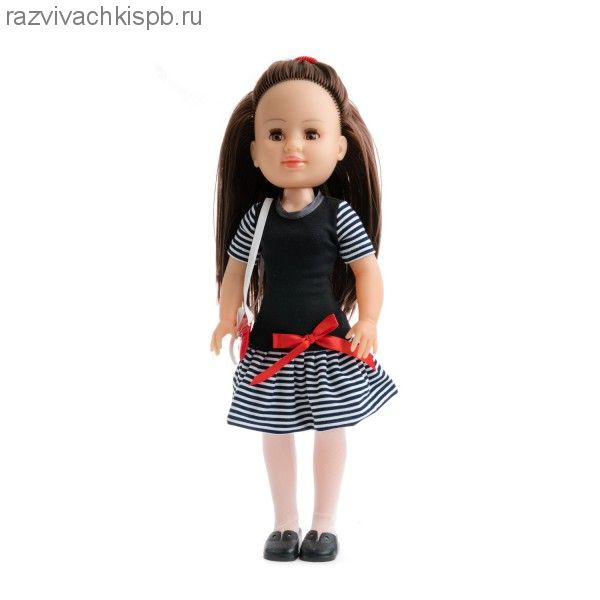 С Изабеллой девочке будет не скучно заниматься, и изучать что-то новое. Кукла может быть верной одноклассницей или примерной ученицей для малышки. На ней надето форменное платье с полосатыми короткими рукавами и юбкой, простые черные туфли и белые колготки. Платье украшает стильный бант. Образ завершает небольшая белая сумочка. Все вещи легко снимать и надевать. Кукла имеет реалистичную внешность: у нее подвижные руки, ноги и голова. Ее можно посадить за парту, а если уложить спать, то она закроет глаза. Волосы Изабеллы выполнены из качественного материала и зачесаны назад. Их легко заплетать и украшать аксессуарами.