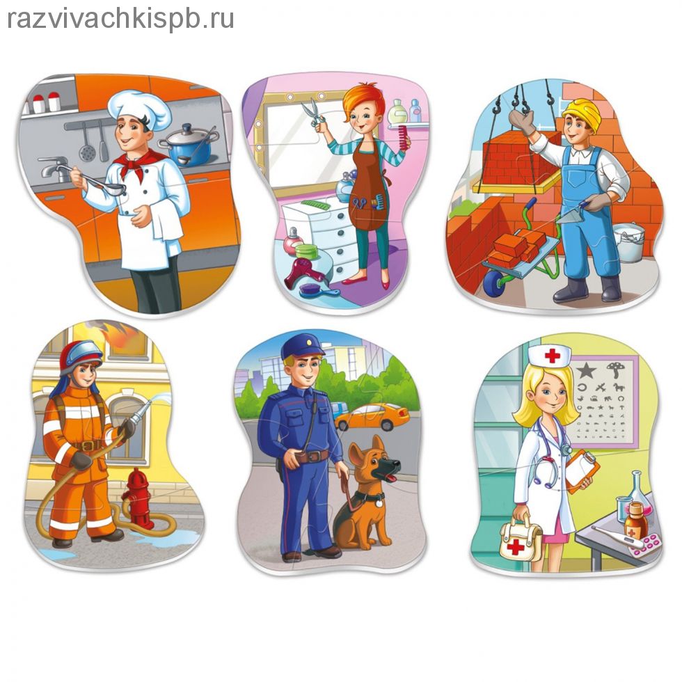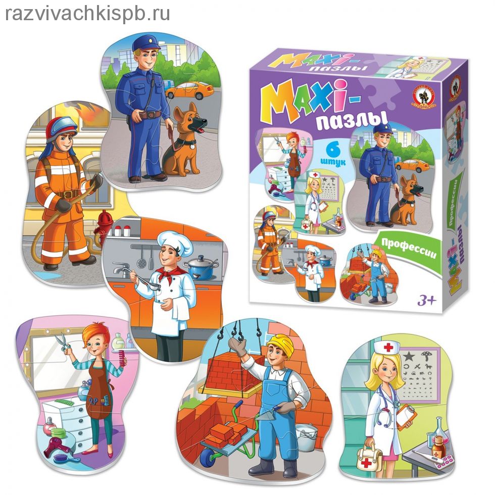«Макси-пазлы» — одна из самых любимых серий игр для малышей! В комплекте 6 пазлов с изображением разных профессий: парикмахер, врач, пожарный, полицейский, строитель и повар. Изображения на пазлах яркие и понятные малышам.