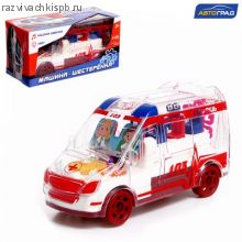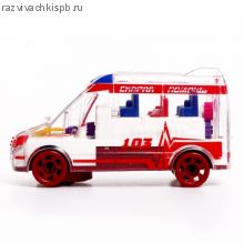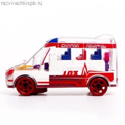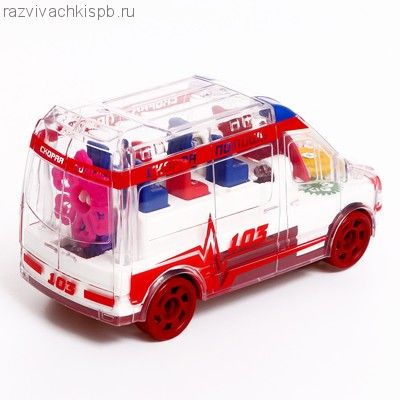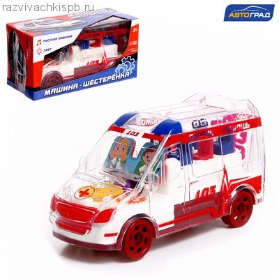 Машина-шестерёнка «Скорая помощь» — это транспорт с прозрачным корпусом. У него внутри есть подсветка и движущиеся шестерёнки! Машинка объезжает встречающиеся препятствия и воспроизводит фразы на русском языке.