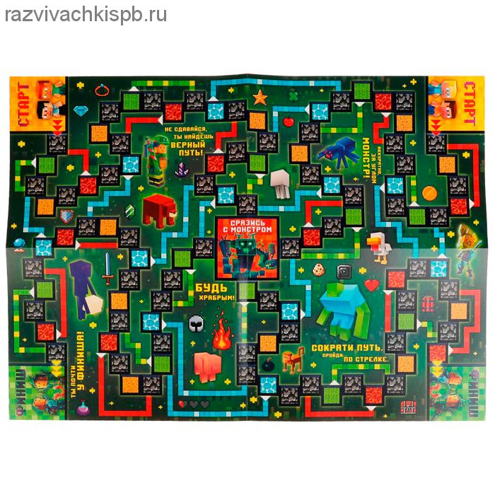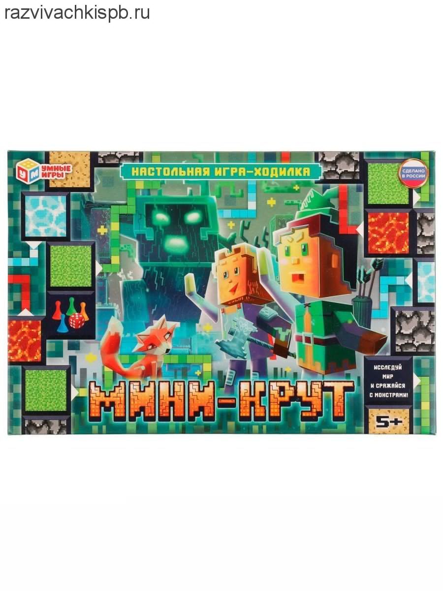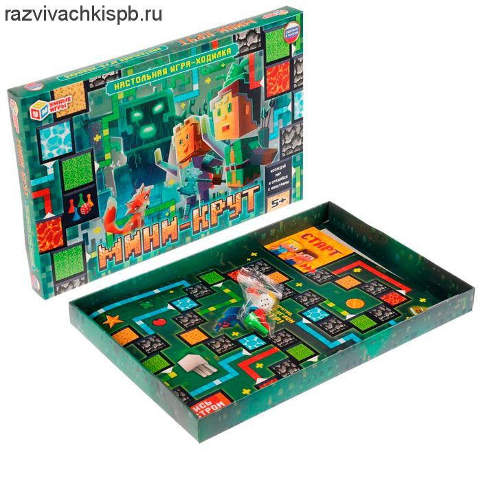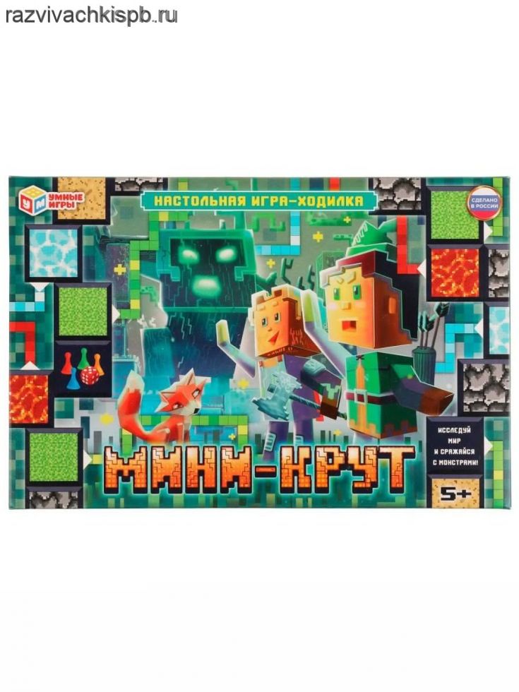 Настольная игра-ходилка "Мини-Крут" по мотивам Майнкрафт ТМ "Умные игры" - это захватывающее приключение в стилистике компьютерных игр: исследуй удивительный мир и сражайся с монстрами!