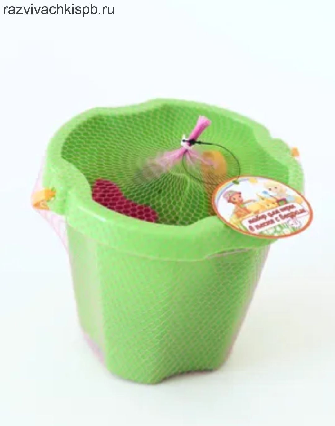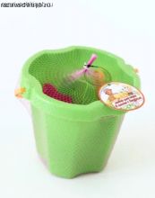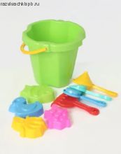 В набор входит ведро с ручкой размер 18*20*16 см, совок, грабли, просеиватель и воронка длиной 13 см, 4 формочки диаметром до 10 см.