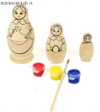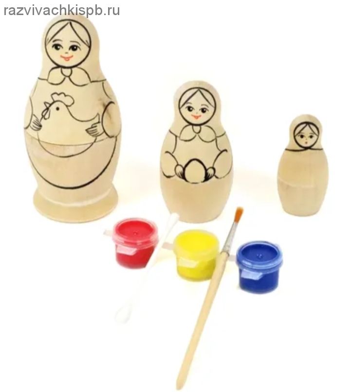 Комплектация - матрешка деревянная – 3 в 1. (большая 11 см, средняя 76 мм, малая 55 мм); кисточка; краски акриловые 3-х цветов (красный, желтый, синий); ватная палочка (двухсторонняя) – 1 шт; инструкция.