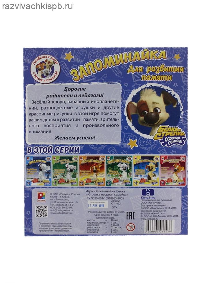 Красочная и яркая игра с веселыми заданиями и героями известного мультика "Белка и Стрелка" - прекрасный способ весело и с пользой провести время с друзьями и в кругу семьи. Игра "Запоминайка" - это занимательный материал, с помощью которого дети смогут развить память, внимание, зрительное восприятие. Этот набор позволит учиться и запоминать важные навыки в процессе увлекательной игры. В комплекте идут правила, после изучения которых родители могут с легкостью организовать игровой процесс. Карты с заданиями напечатаны на плотном картоне высокого качества, а в качестве подарка производитель положил карандашницу, раскраску и наклейки. Помимо основного предназначения, игра может также использоваться для диагностики развития памяти: если малыш легко справляется с большинством заданий, значит, она развита хорошо, если нет, стоит обратить на это внимание. Набор разработан с учетом требований федеральных образовательных стандартов и одобрен педагогами.