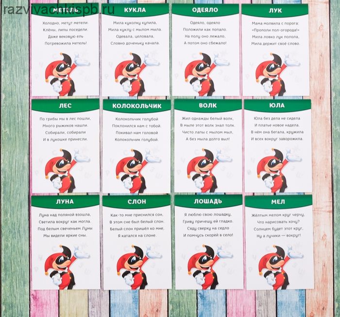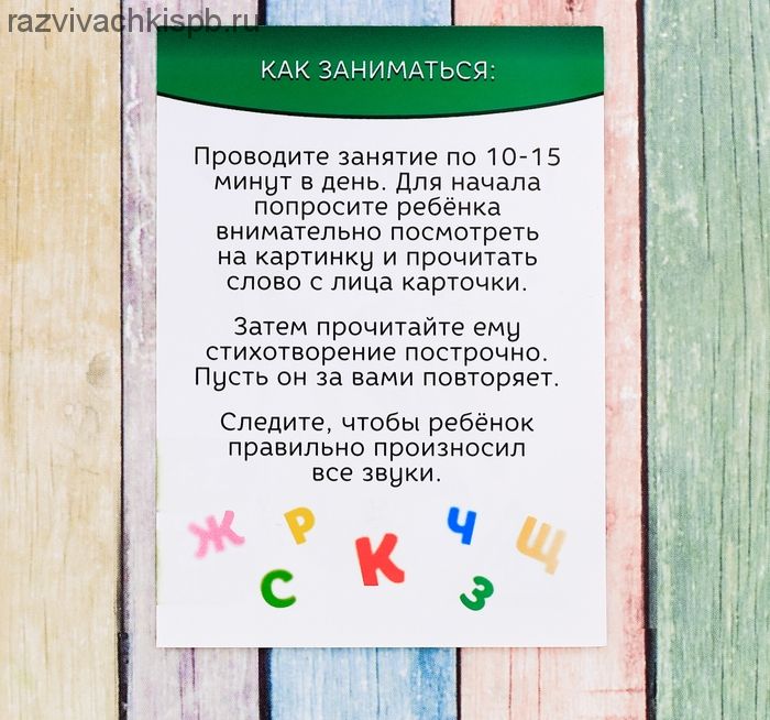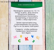Занимайтесь по 10–15 минут в день. Для начала попросите ребёнка посмотреть на картинку и произнести слово с лицевой стороны. Затем прочитайте ему стихотворение построчно. Пусть он за вами повторяет. Следите, чтобы ребёнок правильно произносил звуки. Внутри вы найдёте: 16 карточек.Размер карт: 63 х 87 мм.