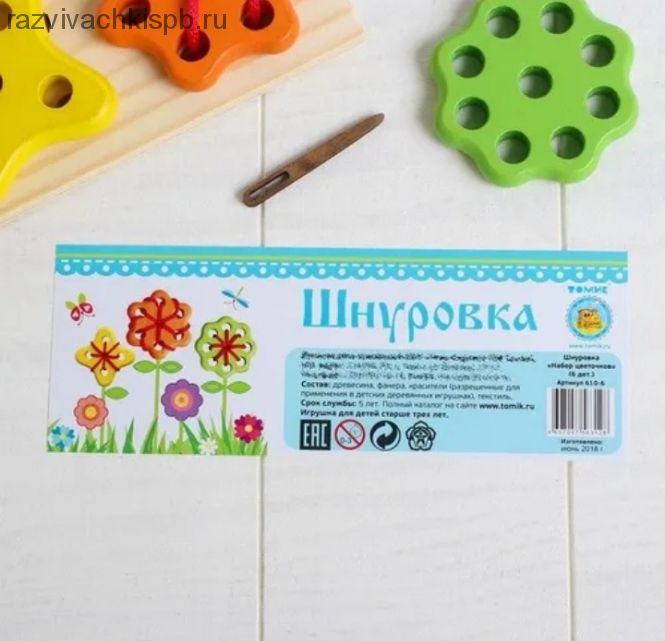 Шнуровка деревянная "Набор цветов", Томик 610-6 - в качестве развивающей игрушки для ребенка как нельзя лучше подходит деревянная шнуровка "Набор цветочков" от торговой марки "Томик", состоящая из 6 деталей: доски-основы, трех деревянных фигурок в виде цветочков, а также шнурка и игла.