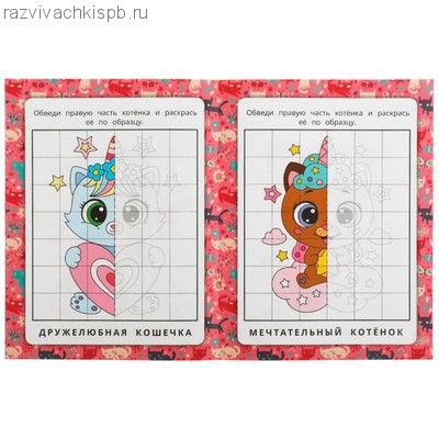 В данной раскраске с иллюстрациями очаровательных котят маленькому художнику предлагается дорисовать правую часть картинки в зеркальном отображении, а затем раскрасить её согласно цветовой гамме левой стороны рисунка. Благодаря простым и понятным картинкам ребёнок сможет потренироваться в рисовании и развить моторику рук.