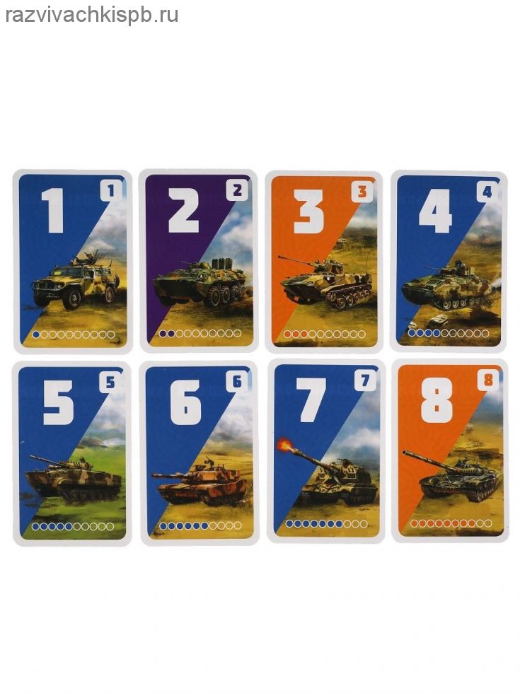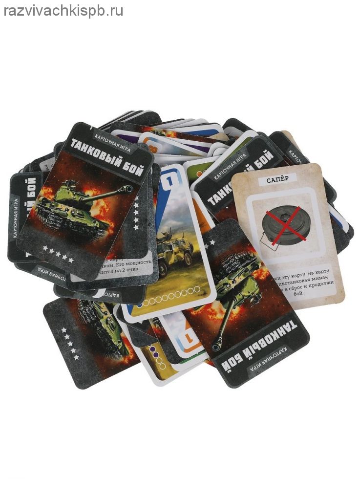 Карточная игра "Танковый бой" ТМ "Умные игры" - увлекательная динамичная игра, в которую можно играть вдвоём или компанией до 6-ти человек.Особенности и комплектация:- 80 карточек: 40 карт с танками, 40 карт спецназначения- понятные правила игры- количество участников: 2-6- продолжительность игры: от 15 минут.