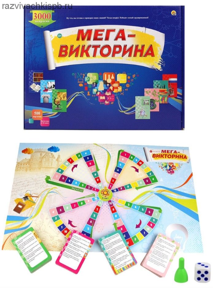 Настольная развивающая игра содержит 3000 вопросов на разные темы. Одновременно могут играть от 2 до 4 человек. Развивают логику, мышление, помогает узнать ответы на разные вопросы.