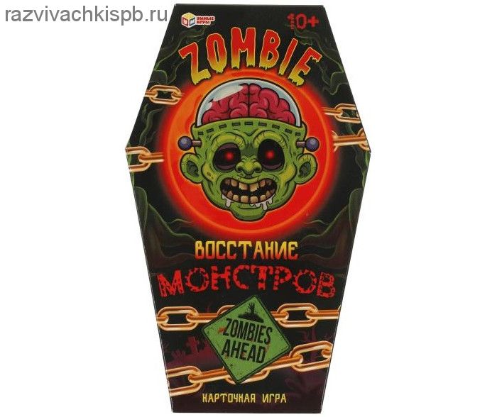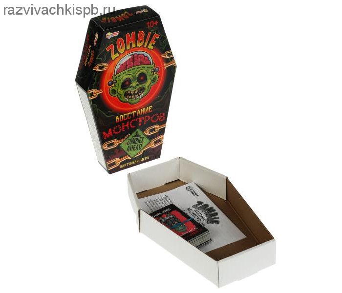 Карточная игра «Зомби. Восстание монстров» погрузит вас в фантастический постапокалиптический мир.В результате очередного эксперимента чокнутый профессор создаёт опасный вирус, но по ошибке заражается сам и превращается в зомби. Потеряв рассудок, он решает захватить город, обращая в разлагающихся монстров всех, кто встречается ему на пути. Задача игрока - не превратиться в полусгнившее чудовище. От страшной участи могут спасти только отвлекающие от заражённых горожан карты: вкусная приманка, сонный эликсир или милый дружелюбный зомби-пёсик. Остальные карты нужны, чтобы не позволить обезумевшему профессору сделать игроков живыми мертвецами.
