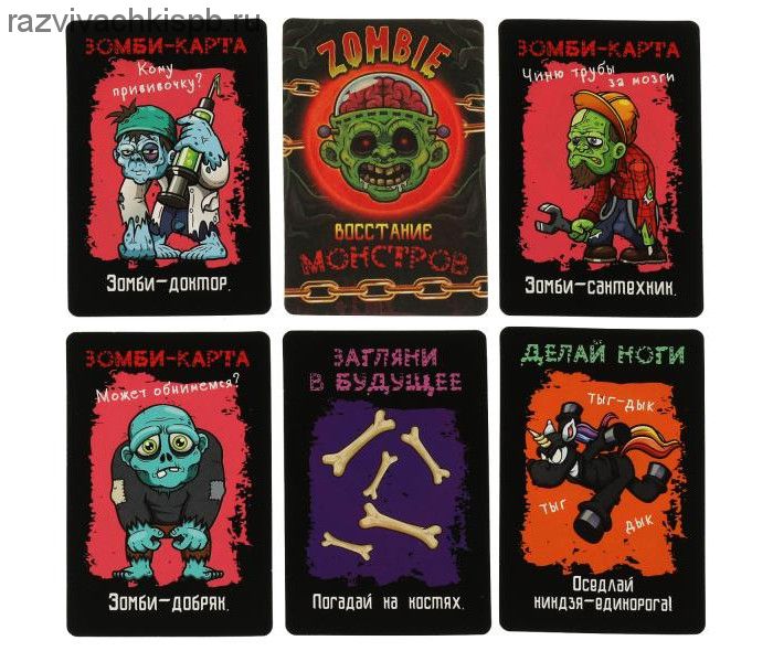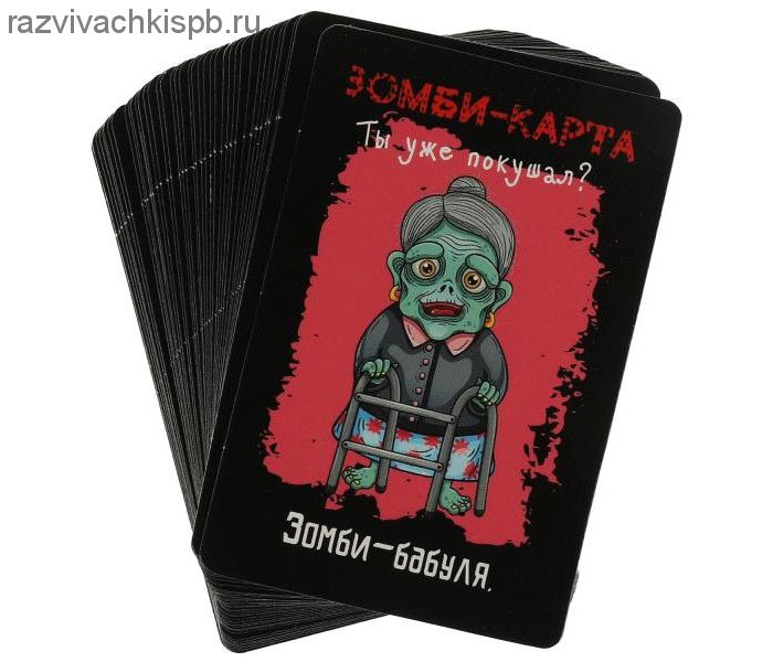 - воображение; - внимание - гибкость мышления Особенности: - оригинальный сюжет - необычный дизайн упаковки - количество игроков: 2 - 4 Состав игры: - 3 карты заражение - 4 карты обезвредить - 3 карты нет - везунчика ответ - 4 карты атакуй - 3 карты мешай - 3 карты делай ноги - 4 карты загляни в будущее - Зомби-карты по 4 карты четырёх видов